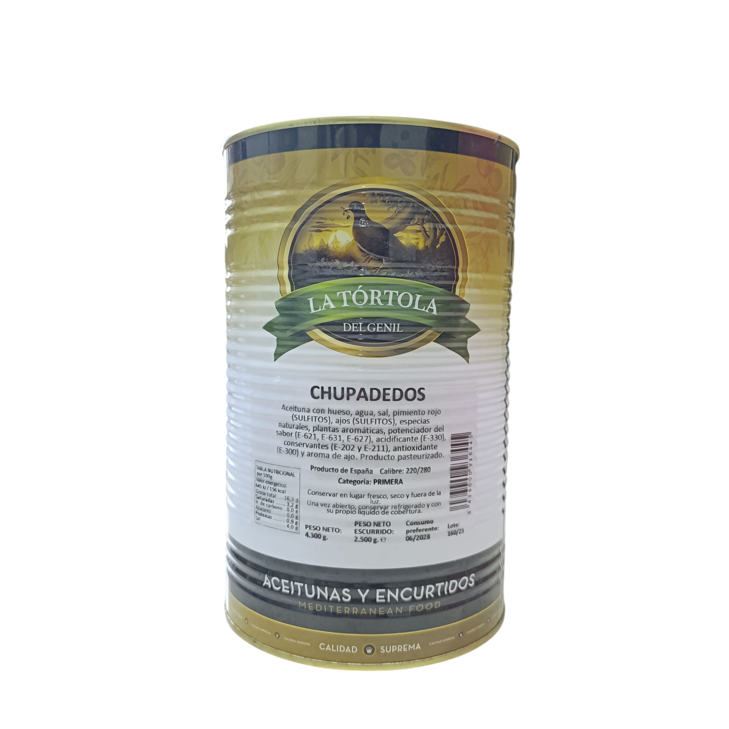 A La Tórtola Chupadedos olívabogyó a mediterrán konyha egyik igazi különlegessége. Ezek a kiváló minőségű zöld olívabogyók a legjobb spanyol ültetvényekről származnak, és magjuknak köszönhetően megőrzik természetes ízüket és állagukat. A „Chupadedos” név, amely szó szerint „ujjszopogatót” jelent, az olívabogyók különösen ízletes, harmonikus aromájára utal, amely minden falatot emlékezetessé tesz.